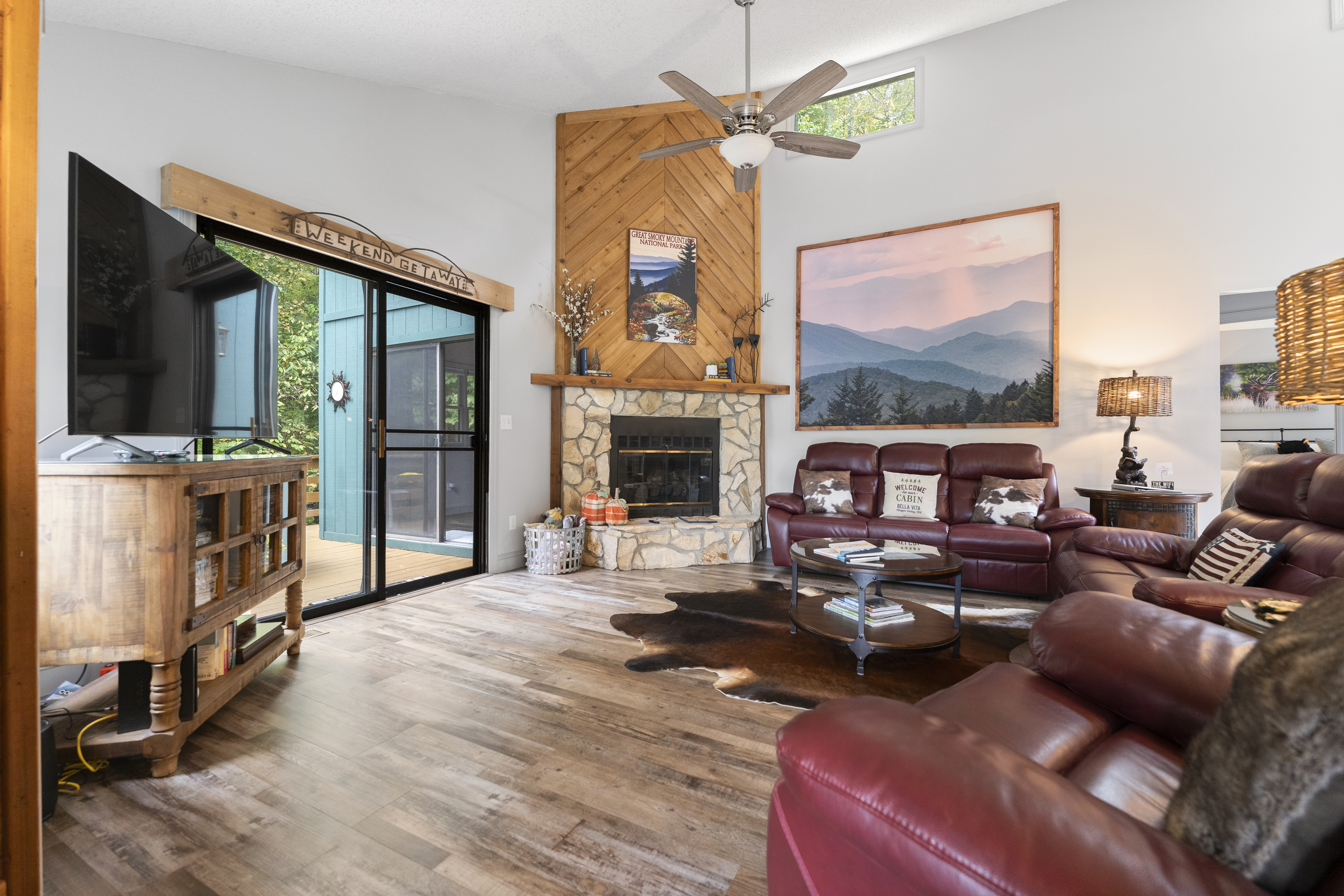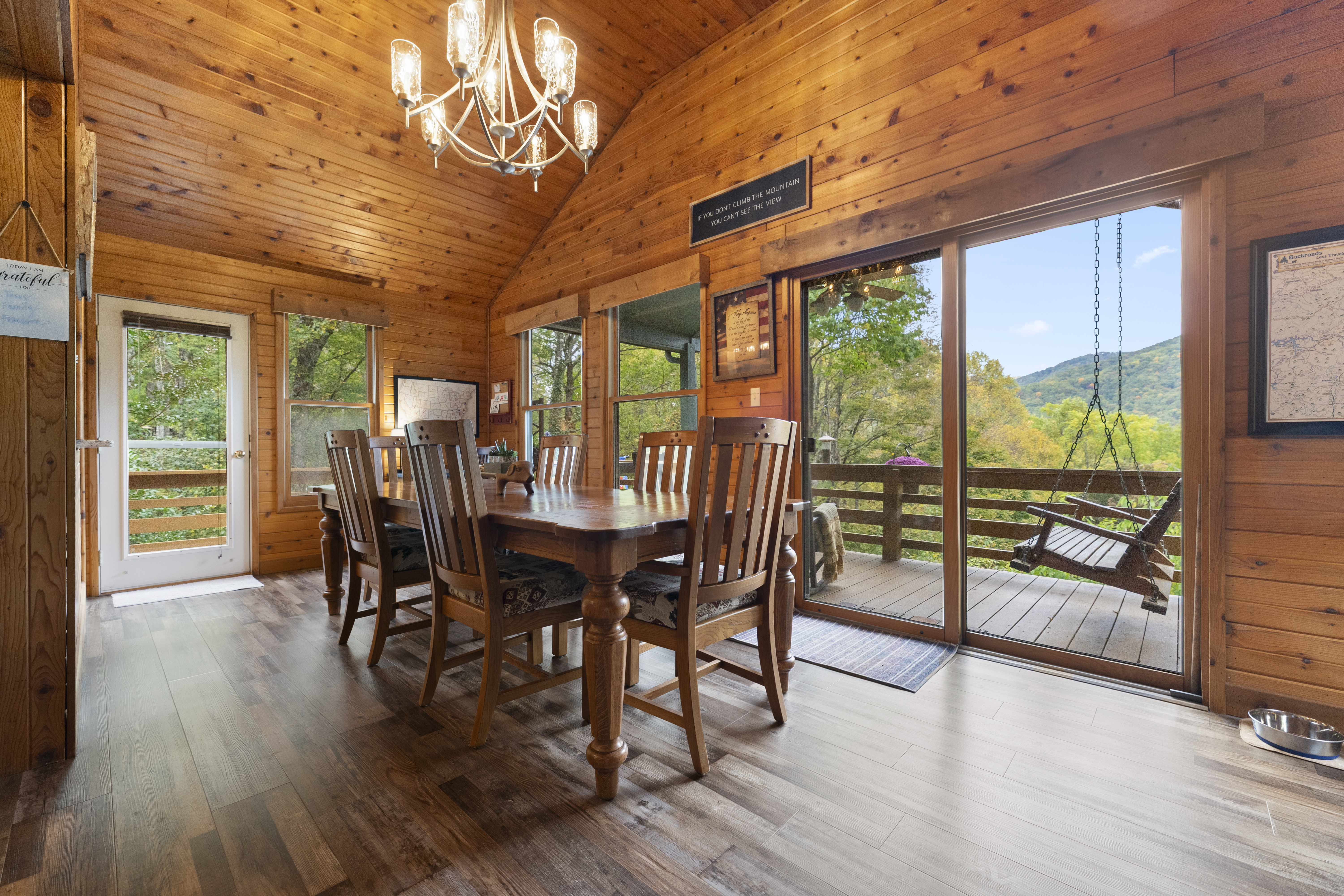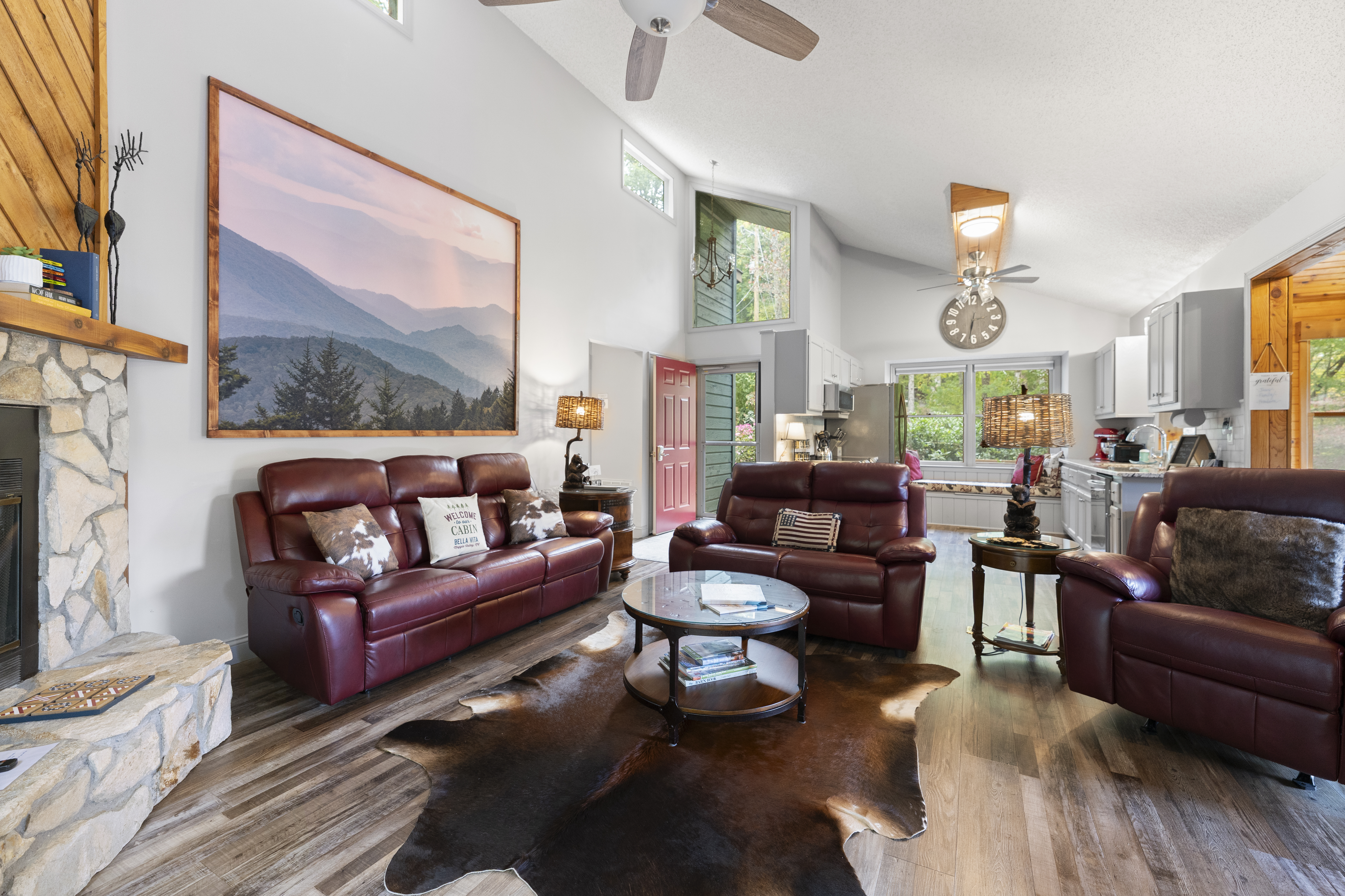 After a day of hiking or sightseeing activities, you will appreciate all the amenities of this Non-Smoking one level home such as central heat and air conditioning, wood floors throughout, stone gas fireplace, refrigerator, ice maker, electric oven/stove, microwave and full-size washer and dryer. The fully equipped kitchen also includes everything you would need for a nice family dinner. You can enjoy a cup of coffee and a biscotti, that is provided, as you wake up to the view of the wonderful mountains. Besides relaxing in the great room, which has lots of windows to enjoy the view, you may want to enjoy the smart TV (60") for streaming or wireless high speed internet access for all your electronic devices. For those families working remote, you will appreciate all the USB ports available throughout the cabin, to charge your many devices and the granite top desk with lamp and USB ports located in the dining room. We also have paper, pens and other remote working items. Of course, you are always welcome to work on either of the two decks while enjoying the great outdoors or next to the gas fireplace with the remote in hand. You could also just take a break and make some s’mores on the fire pit on the deck while taking in the views. For a great night's sleep, the master bedroom includes a king size bed and a private bath with a new large curb-less walk-in shower and double sink vanity. It also features a 50” Smart TV for streaming and access to the private deck to enjoy your morning coffee while catching up on the world around you, watching the songbirds or just taking in all that nature has to offer. Our winter guest can also enjoy the heated mattress pad on both the king size beds for a cozy nights sleep. The second bedroom includes a king bed and a 43” Smart TV for streaming. The third bedroom has two twin beds. Pets are welcome with a non-refundable pet fee of $100, which is sent through the Resolution Center after booking. In order to prevent separation anxiety-induced damage from your usually well-behaved pets, we ask that you either take your pets with you or crate them when you are not going to be with them. We do live on the side of a mountain so please refrain from walking around the cabin as the grounds are uneven and falls could occur. Feel free to walk along driveway since it is relatively flat.