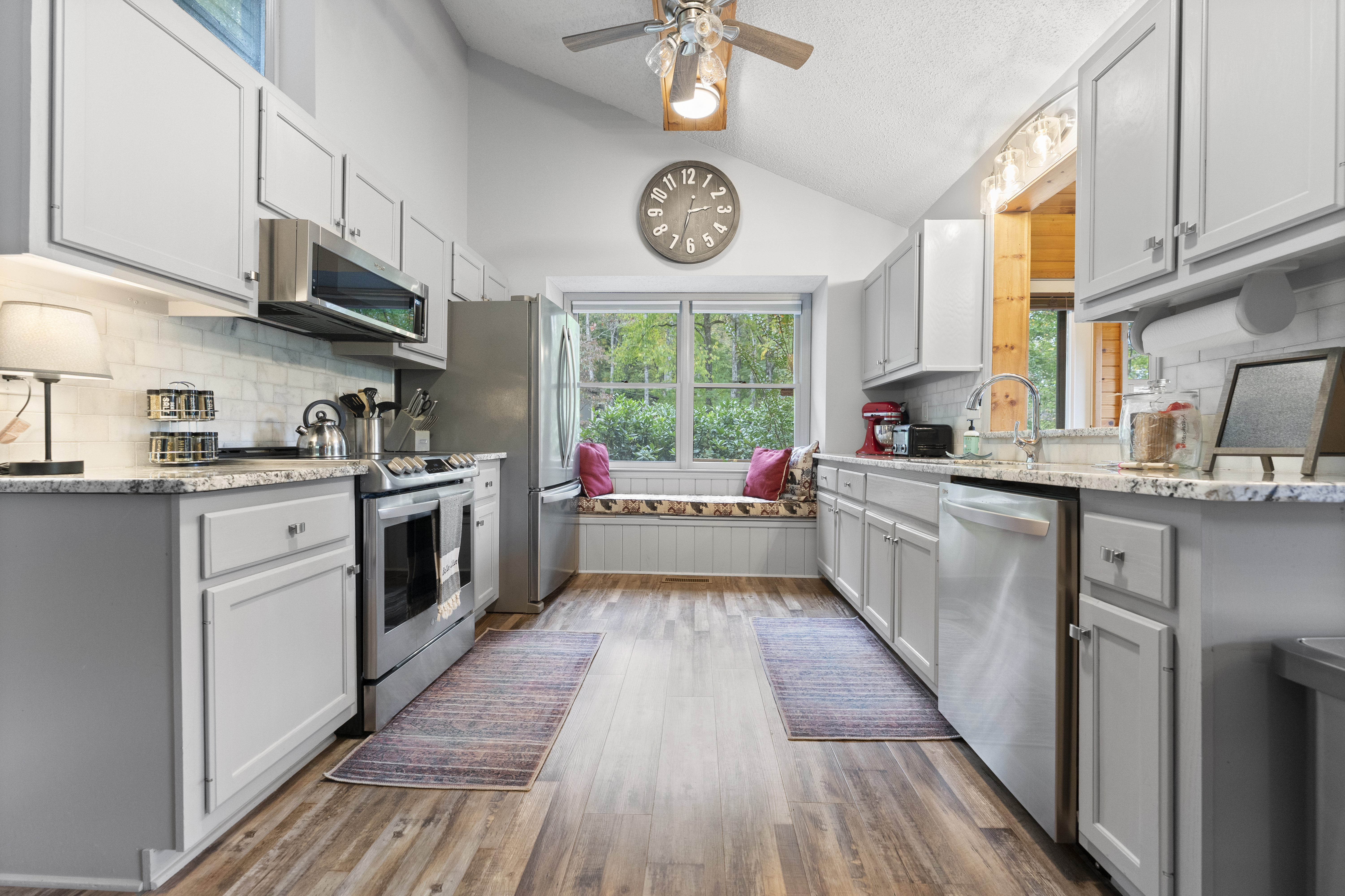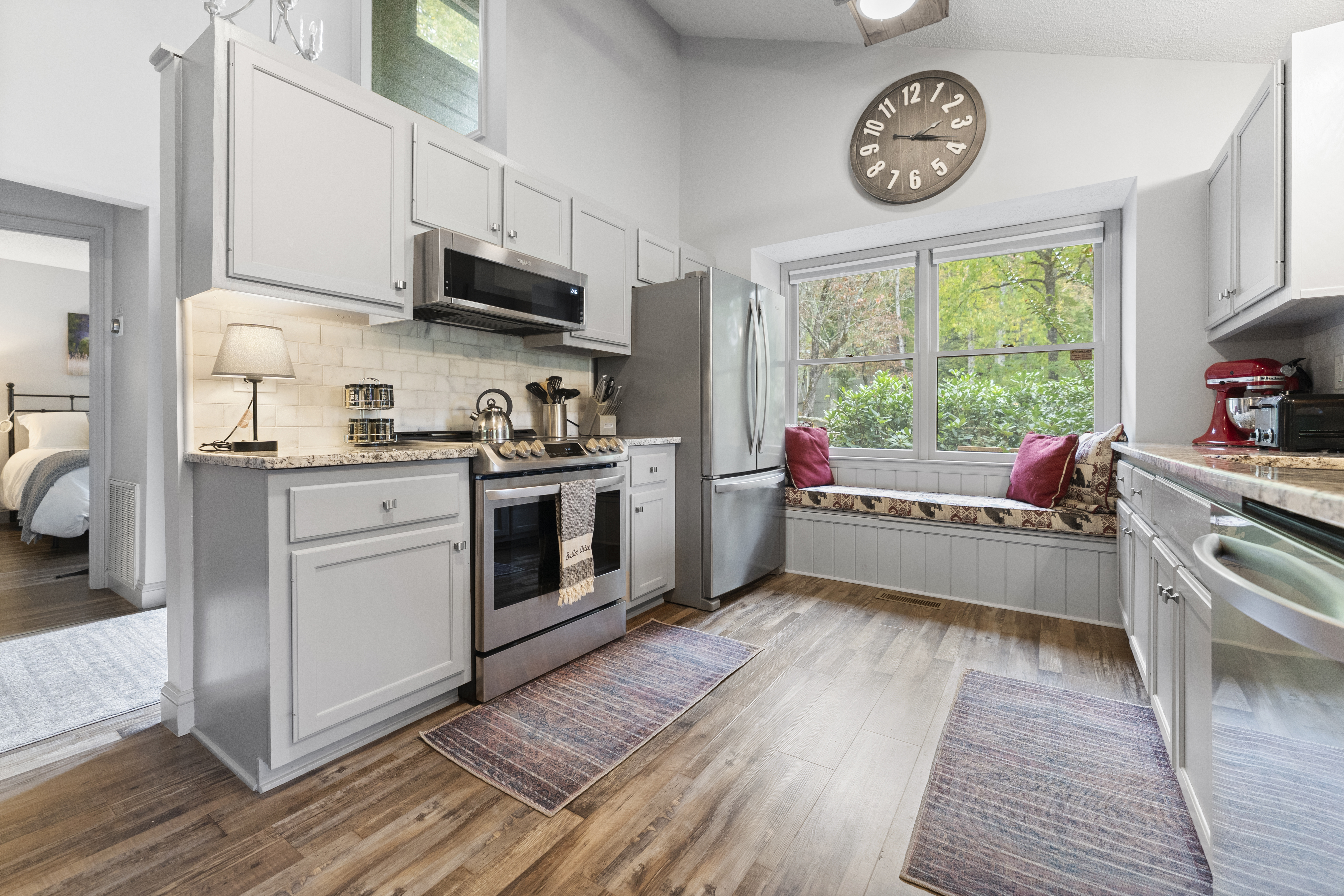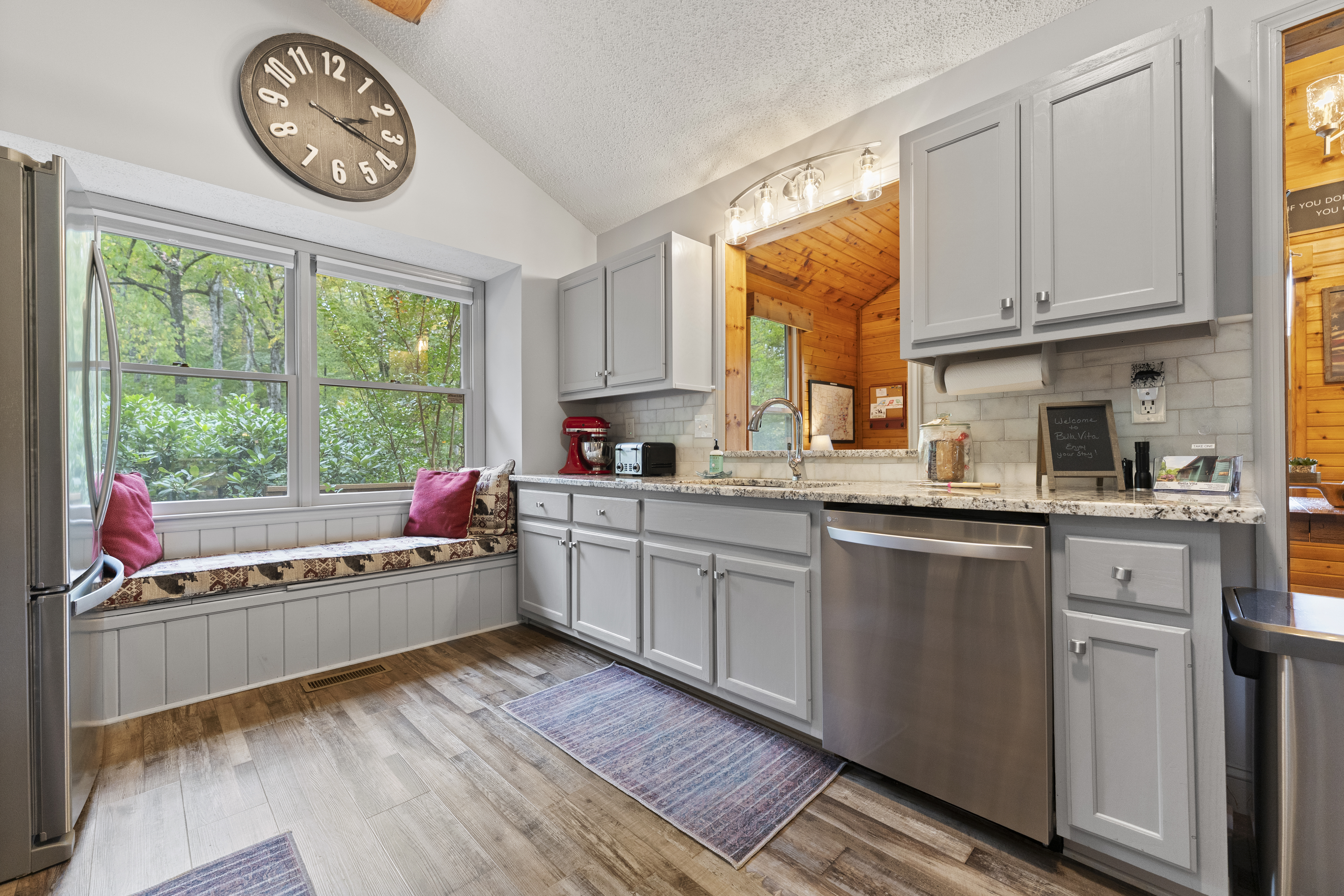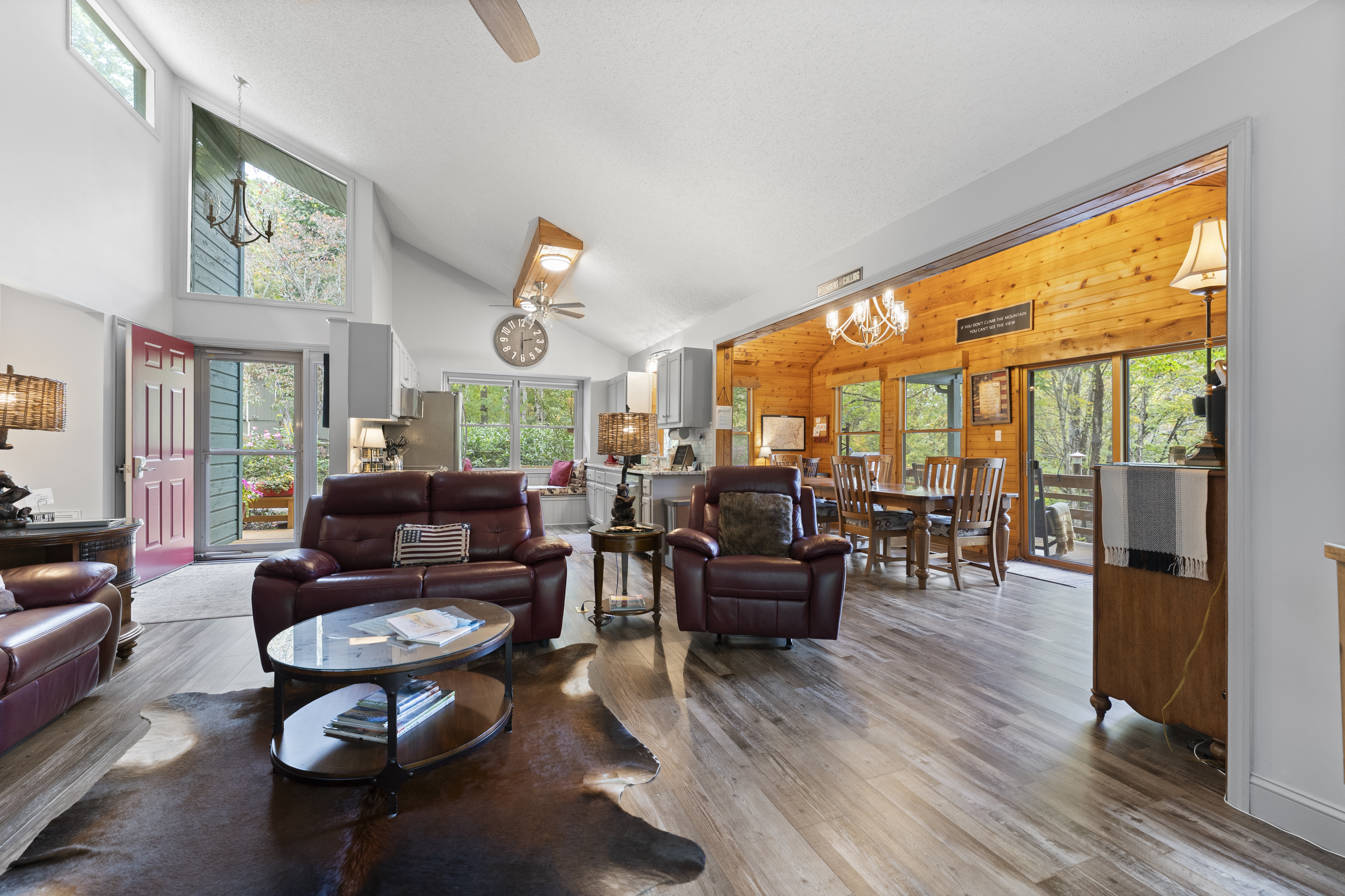 After a day of hiking or sightseeing activities, you will appreciate all the amenities of this Non-Smoking one level home such as central heat and air conditioning, wood floors throughout, stone gas fireplace, refrigerator, ice maker, electric oven/stove, microwave and full-size washer and dryer. The fully equipped kitchen also includes everything you would need for a nice family dinner. You can enjoy a cup of coffee and a biscotti, that is provided, as you wake up to the view of the wonderful mountains. Besides relaxing in the great room, which has lots of windows to enjoy the view, you may want to enjoy the smart TV (60") for streaming or wireless high speed internet access for all your electronic devices. For those families working remote, you will appreciate all the USB ports available throughout the cabin, to charge your many devices and the granite top desk with lamp and USB ports located in the dining room. We also have paper, pens and other remote working items. Of course, you are always welcome to work on either of the two decks while enjoying the great outdoors or next to the gas fireplace with the remote in hand. You could also just take a break and make some s’mores on the fire pit on the deck while taking in the views. For a great night's sleep, the master bedroom includes a king size bed and a private bath with a new large curb-less walk-in shower and double sink vanity. It also features a 50” Smart TV for streaming and access to the private deck to enjoy your morning coffee while catching up on the world around you, watching the songbirds or just taking in all that nature has to offer. Our winter guest can also enjoy the heated mattress pad on both the king size beds for a cozy nights sleep. The second bedroom includes a king bed and a 43” Smart TV for streaming. The third bedroom has two twin beds. Pets are welcome with a non-refundable pet fee of $100, which is sent through the Resolution Center after booking. In order to prevent separation anxiety-induced damage from your usually well-behaved pets, we ask that you either take your pets with you or crate them when you are not going to be with them. We do live on the side of a mountain so please refrain from walking around the cabin as the grounds are uneven and falls could occur. Feel free to walk along driveway since it is relatively flat.