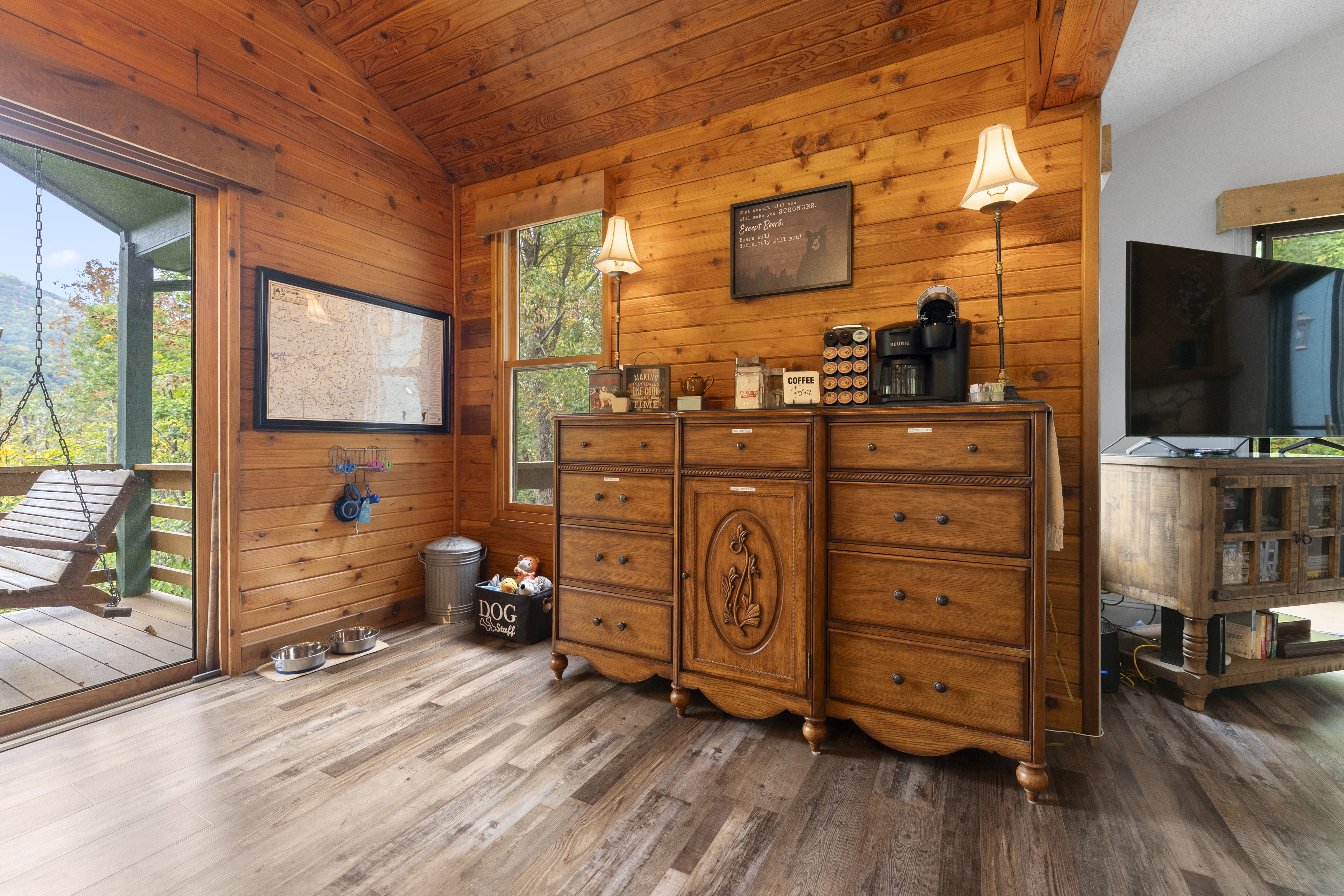 A vehicle is needed to explore the surrounding area. You can always walk the mountain for a little exercise. There is plenty of room to park and turn around. Not too many cabins in the mountains have this.